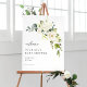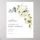 Bem-vindo a convidados para o seu evento com este sinal de boas-vindas personalizável ao chá de fraldas. Apresenta buquê floral de cor d'água de rosas brancas e hidrangeas com sotaques verdes. Personalize adicionando os detalhes do evento. Este sinal floral de boas-vindas é perfeito para chás de fraldas de primavera e inverno. Itens correspondentes estão disponíveis.