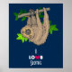 Um desenho bonito de uma preguiça marrom agarrada a um galho com folhas e pendurada de cabeça para baixo. eu adoro preguiças escritas embaixo.