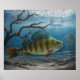 Beneath frozen water, a perch fish notices bait cast by someone ice fishing above.