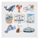 Ícones do Marthas Vineyard: baleia, lagosta, bicicleta, entrada em placas de edgartown, ferry-boat, silhueta da ilha de vinhedo, selo de farol, cesto de vinhedo.