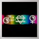 Um fundo texturizado do arco-íris com os sinais masculino e feminino, que incluem o yang-ying no centro das placas. No centro dessa design está um coração com o mesmo sinal. Em uma letra branca está o texto, Love Igualdade.