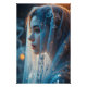 Um retrato de fantasia de uma jovem calma e elegante com perfil virado para a esquerda, iluminada pela iluminação dupla cinemática — luz quente brilhando para cima de baixo e luz ciana legal em cascata de cima. Ela veste um véu azul semitransparente e brilhante bordado com delicados detalhes espumantes. A poeira fina de brilho a rodeia, arrastando-se através de fumaça suavemente enrolada, melhorando a atmosfera mística. O pano de fundo escuro e magnético apresenta pontos brilhantes que acrescentam profundidade e um ambiente mágico. Criado em detalhes hiperrealistas com texturas faciais afiadas, capturando uma presença serena, porém encantadora e poderosa.