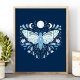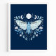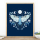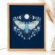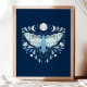 Poster de Ilustração Celestial Abstrato Azul E Branco Moderno. Este design de abstrato místico mágico apresenta uma bela ilustração intrincada da mariposa com as fases lua de cheio e lua de crescente. Adorado com flores silvestres e floresces florais. Estética feiticeira boêmica.