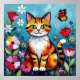 Cat themed poster. A cute orange cat sitting in flowers and surrounded by butterflies. The art is in an impasto oil paper quilling style.