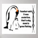 O padre Pinguim, parado com o filho. As imagens foram feitas em uma simples esteira de preto e de órgãos. O pinguim pai e o pintinho jovem foram feitos em linha preta, e o pinguim adulto macho tem uma cor laranja no pescoço. Eu não tenho certeza do gênero do pintinho bebê, pode ser um menino ou uma menina. Do lado direito está uma fronteira negra tribal. Entre a fronteira e o pinguim, há um espaço vazio com texto que pode mudar e que diz: "O professor disse que era evolução, é por isso que a mãe se foi pescar."