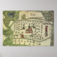 Vintage ilustration antigo world map apresentando parte do Império Asteca no centro do México apresentando um templo no centro provavelmente usado para sacrifício humano. A igreja ou o templo estão cercados por um cemitério com pedras e cruzes. Cerca de 1577. Aztec se refere às pessoas mexicanas de Tenochtitlan, agora a localidade da Cidade do México.