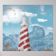 Farol vermelho vermelho vivo listrado e ondas azuis grunge poster impressão. Uma estrutura arquitetônica com listras brancas vermelhas.