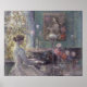 Improvisação (1899) de Childe Hassam é uma pintura de retrato vintage de arte fina impressionista que apresenta uma mulher tocando piano perto de uma janela aberta e flores cor-de-rosa em vasos.