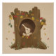 Uma ilustração fofa de um geleia numa árvore oca coberta de folhas coloridas
