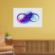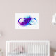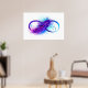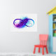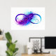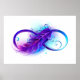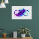 Símbolo infinito com uma bela pena pintada em cores roxas e azuis brilhantes sobre fundo branco.