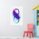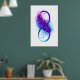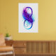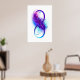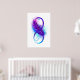 Símbolo infinito com uma bela pena pintada em cores roxas e azuis brilhantes sobre fundo branco.