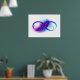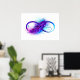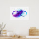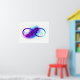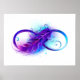 Símbolo infinito com uma bela pena pintada em cores roxas e azuis brilhantes sobre fundo branco.