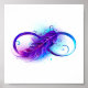 Símbolo infinito com uma bela pena pintada em cores roxas e azuis brilhantes sobre fundo branco.