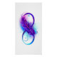 Símbolo infinito com uma bela pena pintada em cores roxas e azuis brilhantes sobre fundo branco.