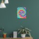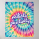 Um poster de arte de rancho com as palavras "radiar positividade" num fundo espiral de corante de gravata. Um design de chic inspirador, moderno e hippie.