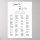 Este elegante gráfico alfabético de assentos é perfeito para um evento especial em qualquer estação. Este sinal pode ser usado para organizar seus convidados em ordem alfabética ou por número de tabela. O na moda apresenta seus nomes escritos em um roteiro de caligrafia negra e sua data de casamento e as palavras "por favor, encontre seu assento" escritas na tipografia serif moderna. Este elegante plano de mesas inclui espaço suficiente para até 120 convidados. Deixe espaço para mais (ou menos) convidados clicando no botão "personalizar" e diminuindo ou aumentando o tamanho da fonte. Projetado para coordenar com a nossa coleção de casamento da na moda Isabella. Não se esqueça de procurar os outros produtos para criar uma chic e coordenar a procura do seu casamento. Se você precisar de assistência para personalizar este produto ou quiser que eu crie itens adicionais correspondentes, entre em contato comigo em admin@albamarie.com. Eu ficaria feliz em ajudar!