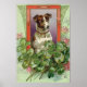 Jack Russell Terrier com quatro trevo de folha e flores. Linda e festiva e colorida imagem de uma raça de cão vintage de um antigo cartão postal anterior a 1920.