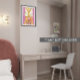 Esta imagem apresenta uma composição vívida onde três flores pontilhadas se posicionam contra um pano de fundo de tijolos. A cena é formada por réguas que formam uma forma X com elementos botânicos adicionais à volta, todos colocados sobre um fundo vibrante e padronizado destacando a mistura de elementos naturais e geométricos.