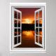 Pôr o sol sobre a água, cena falsa da janela, para uma parede de escritório sem janelas. Poster de cenas de ilusão óptica divertida e realista para um escritório ou uma parede de estudo.
