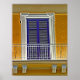 Janela italiana e Balcony, em azul, enquadrado em pedras laranja.