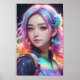 Uma jovem com cabelo pastel multicolor e olhos vibrantes é representada contra um fundo escuro esbranquiçado com luz, emulando um céu estrelado. Ela veste uma jaqueta de couro que reflete um arco-íris de cores e tem acessórios que incluem um clipe de cabelo, uma gravata azul esbranquiçada e brincos de brincadeira.