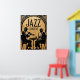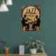 Esta pintura estilizada é uma representação gráfica de um concerto de jazz. Dois músicos, rendidos em silhuetas pretas, estão sentados e atuando, um tocando trompete e outro saxofone. O fundo é um grande círculo dourado texturizado com as palavras "JAZZ CONCERT" em letras negrito. A trabalho de arte tem uma estética minimalista, mas elegante, combinando a sensação clássica de uma performance de jazz com um estilo decorativo moderno.