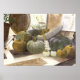 Uma pintura aquosa da fabulosa colheita da minha irmã, exibição de Ação de Graças de várias variedades de abóbora, abóbora, abóbora e alho.