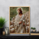 Este trabalho de arte impressionante retrata Jesus como o compassivo Bom Pastor. Central para a composição, Ele é representado numa visão de três quartos, vestido com um roupão esbranquiçado. Seu cabelo castanho claro, sua tez bronca, e barba refletem Sua natureza humilde e quente. Trancando um carneiro num braço e segurando um funcionarios de pastor no outro, Ele lidera seu rebanho com cuidado delicado. A cena é colocada em uma paisagem pastoral exuberante, com colinas verdes rolantes e folhagem vibrante. Espalhados ao redor de Jesus estão ovelhas com marrom claro e lã bronzeada, criando um cenário harmonioso e pacífico. Acima, um céu azul macio com nuvens espalhadas aumenta a atmosfera serena. A iluminação difusa lança realces suaves, melhorando o humor tranquilo. Lembrando-se das pinturas religiosas tradicionais, esta peça é rica em detalhes e cores, capturando a essência da fé e do cuidado. Serve como um lembrete reconfortante do amor de Jesus e orientação para Seus seguidores. Ideal para espaços de reflexão ou como um presente significativo, este trabalho de arte encarna lindamente a mensagem eterno do Bom Pastor observando sobre seu rebanho.