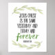 Linda escrita de pincel design de tipografia da caligrafia com palavras de hebraicos 13:8, "Jesus Cristo é o mesmo ontem e hoje e para sempre." O design é acentuado no topo e no fundo com louros de aquarelas verdes.