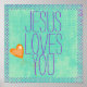 Jesus Te Ama Poster. Poster de mensagem cristã inspiradora com um fundo bolinhas angustiado/vestido em verde e roxo. Lê "Jesus ama você"; pode ser personalizado com o nome da criança. Acentuado com um balão de cor laranja.
