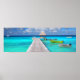 Poster do Panorama de um jato de madeira com alguns barcos coloridos e uma cabana amarrada na lagoa azul turquesa da ilha tropical do Pacífico, Rangiroa, perto do Taiti e Bora Bora na Polinésia Francesa. Excelente decoração de verão na sua parede!