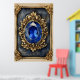 A jewel adorned with a large blue gemstone, likely a sapphire or tanzanite, set in a detailed gilt Baroque-style frame.
