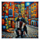 A.I. criou impressão homem com barba e um chapéu está sentado em um banco tocando acordeão numa praça colorida e estilizada da cidade. As ruas de Cobblestone e os edifícios em forma de cinzas com cores brilhantes sob um céu noturno dão à cena uma qualidade de sonho.