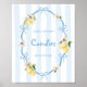Brilhante, alegre e fácil de exibir, este sinal de "Adivinhem quantas moedas" é estilizado com limões de cor d'água, delicados arcos azuis e listras de eterno — perfeito para envolver convidados em um jogo clássico de adivinhação de chás de fraldas com uma torção mediterrânica.