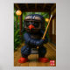 Kagu Kendo Master Esta imagem é de um personagem estilo Yanbaru Kuina vestida em uma armadura tradicional de kendo. O personagem veste um kendogi azul escuro (uniforme), um bogu protetor (blindagem) com máscara facial e calçados vermelhos brilhantes. Seu rosto é um bico estilizado, e ele segura um shinai (espada de bambu) em suas mãos. O fundo parece ser um dojo tradicional japonês ou um edifício com chão de bambu, colunas de madeira e lanternas de papel penduradas no teto. Plantas verdes e exuberantes são visíveis no fundo, sugerindo um cenário tropical ou externo. O personagem é colocado como se estivesse pronto para praticar ou dobrar.