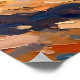 Essa imagem captura o movimento dinâmico de um canguru batendo em uma paisagem árida. A pintura apresenta uma escova expressiva e solta e uma paleta de cores vívidas, com o canguru rendido em laranjas ricas e acastanhado contra um pano de fundo de um céu azul claro pontilhado com nuvens brancas e peludas. Florestas dispersas sugerem o ambiente australiano de retorno.