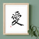 Este personagem kanji é pronunciado 'ai' e é usado para expressar amor e afeto. A artista Brush Sanae criou manualmente este trabalho em seu estúdio em Kyoto. Então digitalizamos para uso aqui. O selo vermelho de Sanae no canto inferior esquerdo da caligrafia adiciona um traço de cor vibrante e o personagem kanji preto escrito em um estilo ousado em uma simples base branca dá a esta design uma energia e um fluxo dinâmicos.