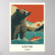 Celebrate the iconic wildlife of Katmai National Park, Alaska, with this striking vintage travel design. Featuring a powerful bear fishing for salmon in a river, a quintessential Alaskan wilderness scene.