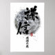 Kenshin "謙 信", Uesugi Kenshin, um famoso samurai no período sengoku, e Dragão de Echigo "越 後 龍" é o elogio dado a Uesugi Kenshin por sua proeza marcial no campo de batalha, escrita no estilo caligrafia. Ao fundo está o kamon de Uesugi "Uesugi Sasa(Uesugi Bamboo)".