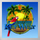 Pintura do pôr do sol Key West Beach com palmeiras, estrutura redonda de bambu e um papagaio colorido.