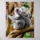 Urso coala adulto com criança nas costas, pendurado numa árvore na Austrália.