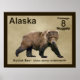 Outra na série de selos postais de uma hipotética nação independente do Alasca. Possui uma pintura digital de um Urso Kodiak em um pergaminho neutro, ou papel antigo, fundo. Os textos "Alaska", "Postage 8 Nuggets" e "Kodiak Bear Ursus arctos middendorffi" também aparecem. O Urso Kodiak (Ursus arctos middendorffi), uma subespécie do urso pardo, ou grizzly, são os maiores ursos do mundo. Um macho adulto pode ter mais de 10 pés de altura quando ereto sobre as pernas traseiras e pesar mais de 1500 libras - uma visão verdadeiramente segura. Um urso no Bismarck, o zoo de Dakota do Norte, estimava-se ter pesado até 2400 libras. Os ursos vivem nas ilhas do Arquipélago Kodiak do Alasca. Atualmente, há cerca de 3500 ursos Kodiak e o seu número está a aumentar devido ao estado geralmente excelente do seu habitat, incluindo peixes suficientes para comer. Eles são chamados de takuka-aq, em Alutiiq, a língua das pessoas nativas daquela área. Acredita-se que os ursos tenham sido isolados lá desde o final da última Era do Gelo há mais de 12.000 anos. Embora sejam o maior carnívoro terrestre, a sua dieta inclui grandes quantidades de erva, outras plantas e bagas. Atualmente, há cerca de 3500 ursos Kodiak e o seu número está a aumentar devido ao estado geralmente excelente do seu habitat, incluindo peixe suficiente para comer. Devido à abundância de recursos comidas, os ursos Kodiak têm intervalos mais pequenos do que quaisquer outros ursos pardos e não têm necessidade de defender territórios. As pessoas Alutiiq caçavam ursos para comidas, roupas e ferramentas. Setas, lanças e excelente de coragem eram necessárias para caçar equipamento. As cabeças de ursos costumavam ser deixadas no campo como sinal de respeito ao espírito dos ursos.