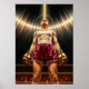 Uma pintura de petróleo monumental e heroica de ângulo extremamente baixo, representando uma boxeadora feminina como deusa clássica em shorts de crânio, sua forma poderosa e hiperrealista definida pela iluminação caravaggésica dramática contra o brilho teatral da arena.