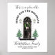 Um laboratório preto giro (Labrador Retriever) vestindo uma gravata de arco rosa e parado em uma varanda frontal decorada para o feriado, com árvores de Natal com estrelas flanqueando a elegante porta preta, uma coroa pinheira com arco de gingham rosa, e lanternas cortadas com rosas e sagradas. No estilo da Magolia | construção moderna | elegante clássico. Personalize com o nome da sua família, membros individuais da família ( e o seu cão) e data em que a sua família foi criada.