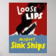 Esta poster da Segunda Guerra Mundial apresenta um navio afundando no oceano. Declara, "Lábios Perdidos Podem Cantar Navios". Celebrar a História Americana e WW2 com este produto de poster de guerra vintage restaurado digitalmente da "The War Is Hell Store". Quer mais produtos militares e históricos? Check-out