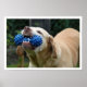 Fotografia de um laboratório amarelo com um brinquedo na boca.