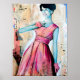 Print of my original acrylic and collages painting of a blue woman wearing a pink dress