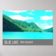 Viagem com fotografia original da paisagem do belo Lago Azul ou Lago Tikitapu, na região de Tarawera, na Nova Zelândia, com vista à água azul e às montanhas ao fundo. Impressão de viagem Cênico da Nova Zelândia. Cores modernas estranhas.