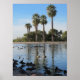 Aqui vocês veem um lago e patos no lago e na margem e palmeiras ao fundo. Um lugar agradável e relaxante para visitar e está localizado dentro da cidade de Phoenix.