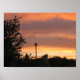 Silhueta de folhas de carvalho, um posto de lâmpada e um pássaro em voo...contra um lindo pôr do sol rosa.